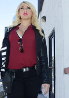 Полицейская, работающая под прикрытием, сидела в машине и наблюдала за происходящим на улице, а потом вошла в здание и там закрылась в туалете. Став перед зеркалом, жопастая блондинка, работающая в правоохранительных органах, оголила булочки, а потом переоделась в черную униформу, чтобы можно было пойти патрулировать район.