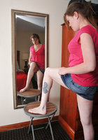 Сидя перед зеркалом на круглом стуле, полная девушка похвасталась своей татуировкой на ноге и сняла с себя джинсовую юбку, чтобы покрасоваться попкой в красных трусах и в рубахе такого же цвета. Когда пришло время показывать гладкую писю и анус, телка с растяжками на животе разделась догола и выставила напоказ интимные места около шкафа.