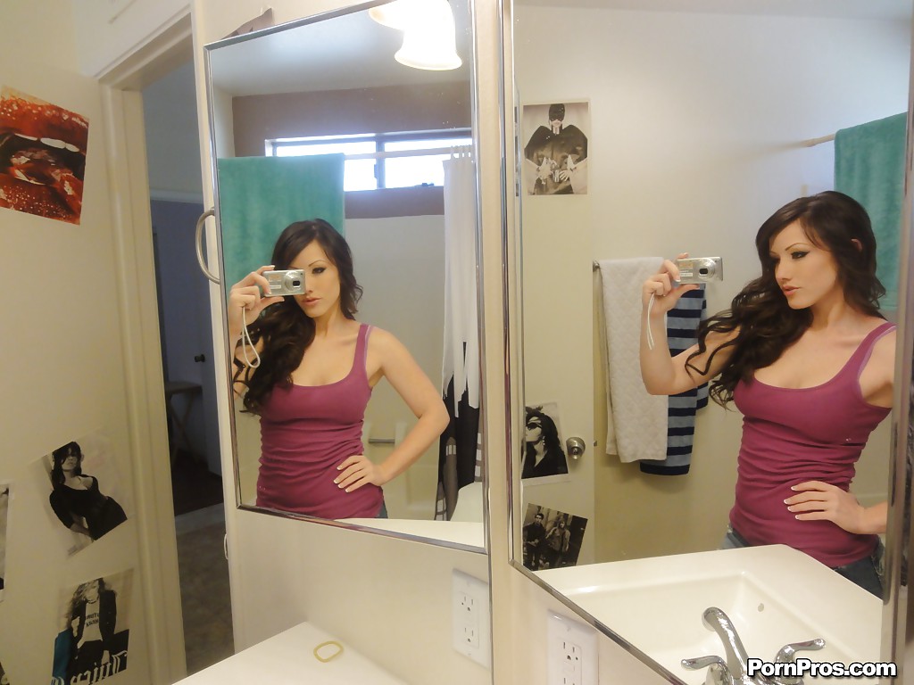 Длинноволосая европейка делает интимные селфи перед зеркалом